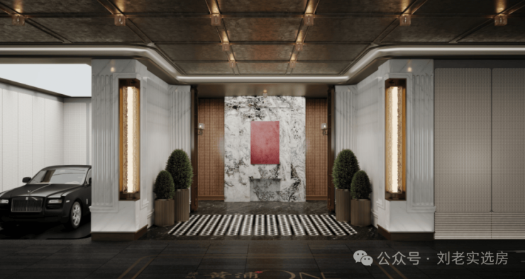 例如入户玄关铺设有“石材皇后”鱼肚印象,这种级别的奢石在很多顶豪项目中通常仅作局部镶嵌