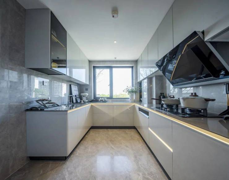 U型厨房:厨房采用U型布局,并巧妙融入飘窗元素,拓宽视野同时增添休闲氛围。