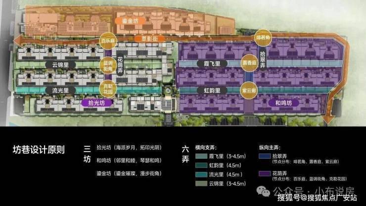 “六巷”则包括了“花荫、拾翠”两弄,以及“云锦里、流光里、霞飞里、虹韵里”四里,通过植物的季相变化和光影设计,营造出富有韵律感的归家动线。