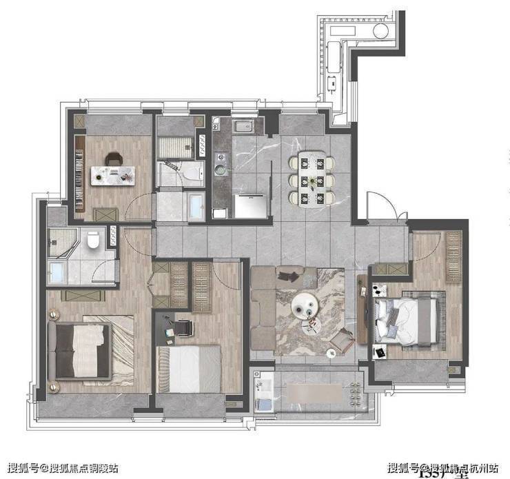 该户型贴合当代人居生活习惯,既适合三口之家小太阳家庭,也可以是三代同堂,每个人都能拥有独立空间。