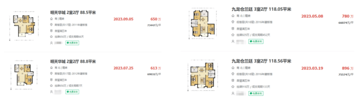 第二,与周边品质次新相比,九龙仓兰庭近期有6.6-7.5万/㎡房源成交,明天华城近期有6.9-7.3万/㎡房源成交。