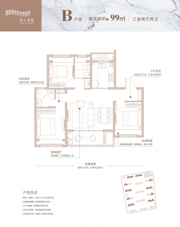 约99㎡户型“南向三开间+阔尺大横厅”,餐客一体+大阳台一字排开,纵深空间无限拉长,南向主卧室套房享受,可放双人大床&衣柜&床头柜,活动空间绰绰有余,主次卧分离,生活互不打扰,整体设计上几乎无浪费空间,备受青睐。
