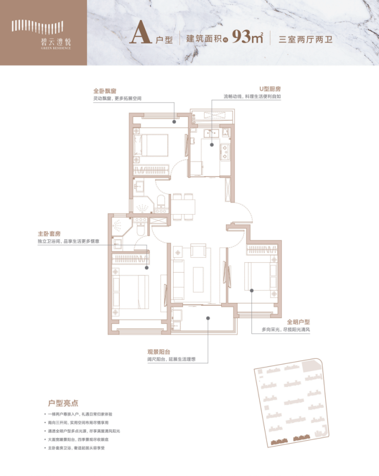 约93㎡户型做了两卫,套房主卧,居住空间相当舒适了。