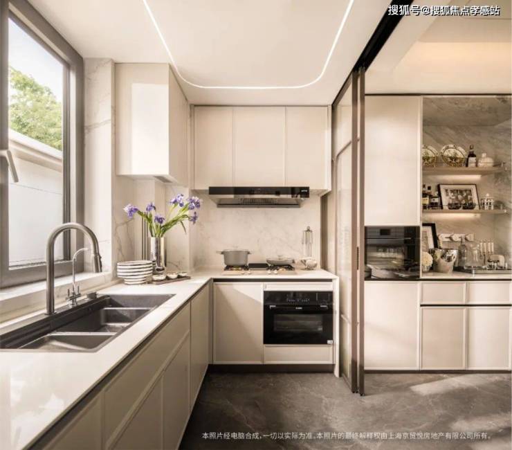 此外,归家门厅墙面石材镶嵌意大利毕加索奢石,地面大理石水刀海派拼花,及厨房和餐厅中间用无地面链条设计的海派金属玻璃移门隔开,方便地砖通铺...种种匠心细节,无不印证西派海上打造张江标杆的决心。