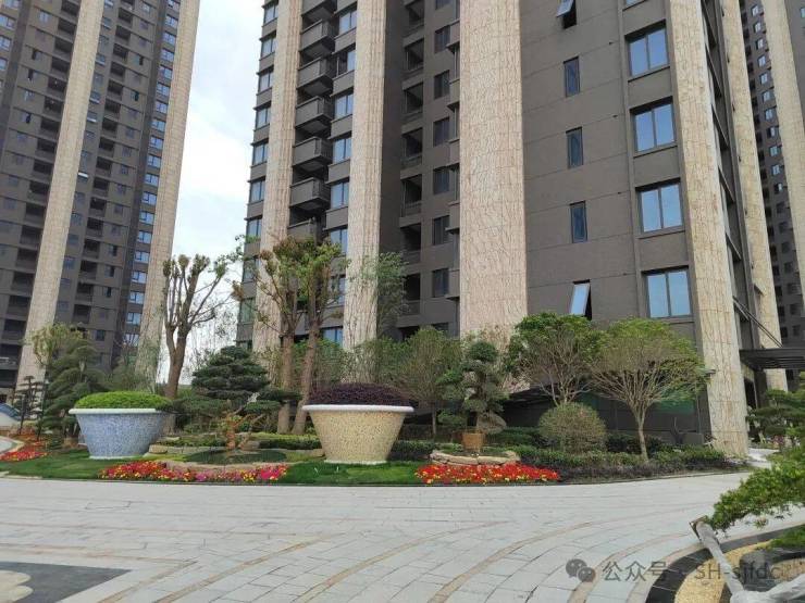 社区外部沿街绿化景观,由多重花坛组成,搭配大小灌木和香樟等名贵树种;