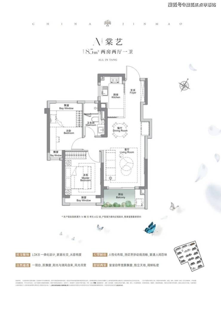 建面约85㎡两房:竖厅设计+独立玄关+双开间朝南,次卧飘窗拓展空间,适配年轻夫妻首置;