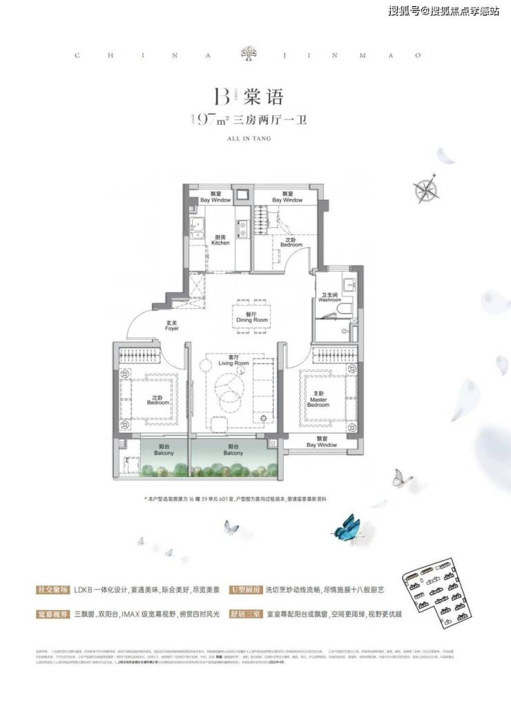 建面约117㎡三房:同样飞机户型,做到了惊人的3开间朝南+4个飘窗+主卧套房设计+270°转角飘窗,尺度感大大提升,一步到位的大三房户型,定义终极改善标准!