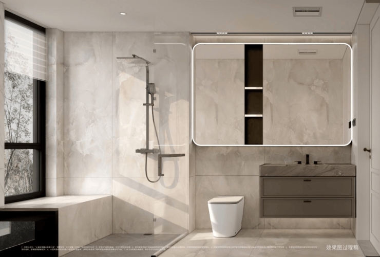 配备美妆龙头,大容量镜柜可收纳洗漱用品,利用墙面空间设置壁龛,便于存放毛巾、衣物便于取用。