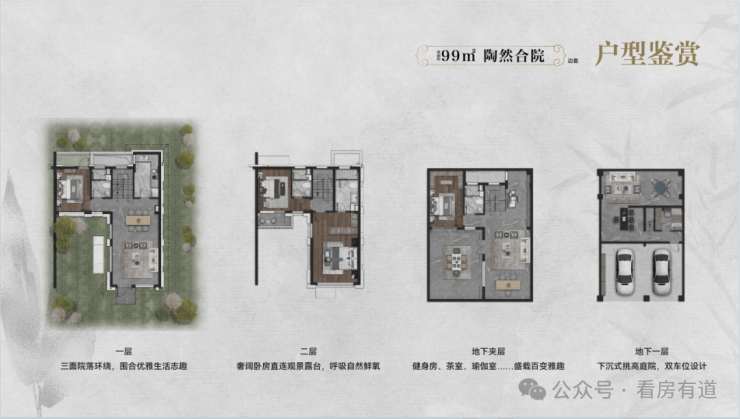 约99㎡合院产品做到了地上2层,地下室挑高5.5米。
