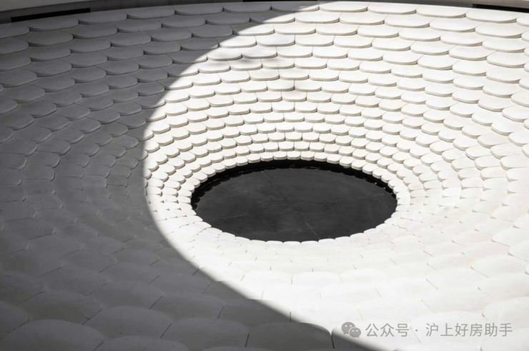 浮光池院水院会客厅,现已实景呈现,水景中央的艺术小品,如一滴水在湖面晕开,泛起阵阵涟漪。