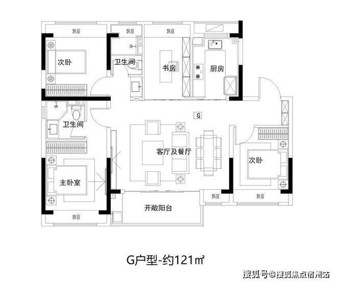 建面约121㎡ 4房2厅2卫,宽境4房,拓宽空间尺度;大开间、进深短,通透采光;主卧独立卫浴,优雅随心的寝居感受。