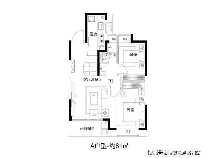 建面约81㎡2房功能齐全,拥有朝南大面宽和全卧飘窗设计。