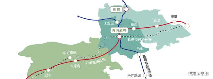 市域铁路:未来市域铁路嘉青松金线,将贯穿嘉定、青浦、松江和金山,届时白鹤将与青浦新城直接连通,并换乘轨交17号线和沪苏嘉城际线。