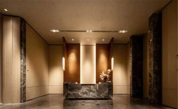 ·威尼斯棕大理石打造的接待台,以古木年轮般的沉稳质感,在光影变幻中流淌出世家大族的时光厚度;