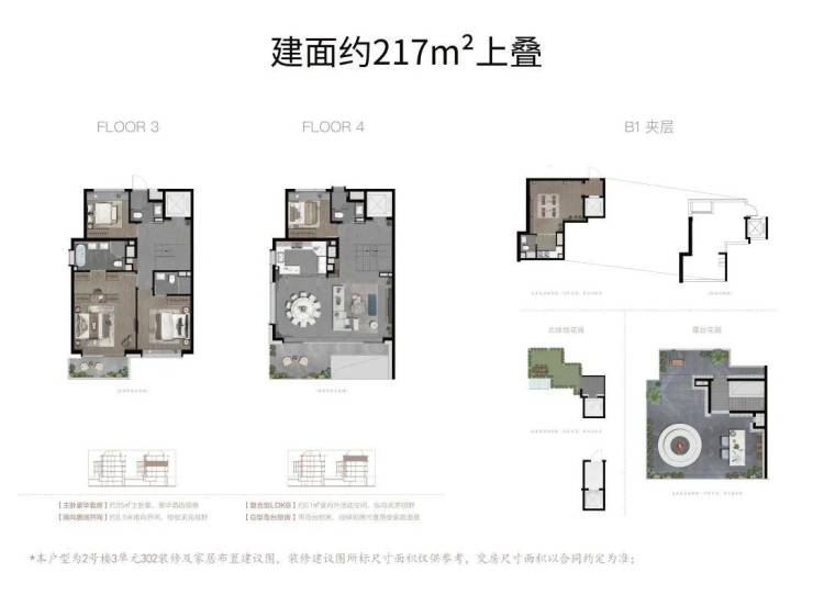 在所有叠墅户型中,下叠往往是更具“墅感”的,我们以主推的建面约200㎡下叠产品为例,来解析一下这个产品: