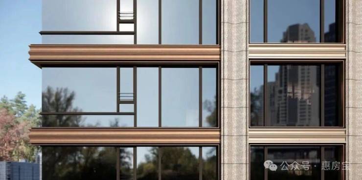 中海环宇玖章可视面都是古铜色金属铝板、米黄色铝板/石材、边套270°大转角飘窗,且从正面、侧面到背面,立面都保持精致统一,四面平权尽显高端质感。