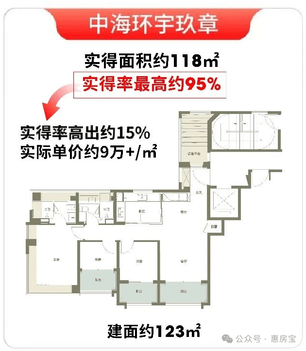 项目约123㎡户型,实得率最高约95%,而周边非新规 / 二手房实得率普遍只有约80%。