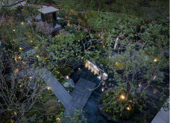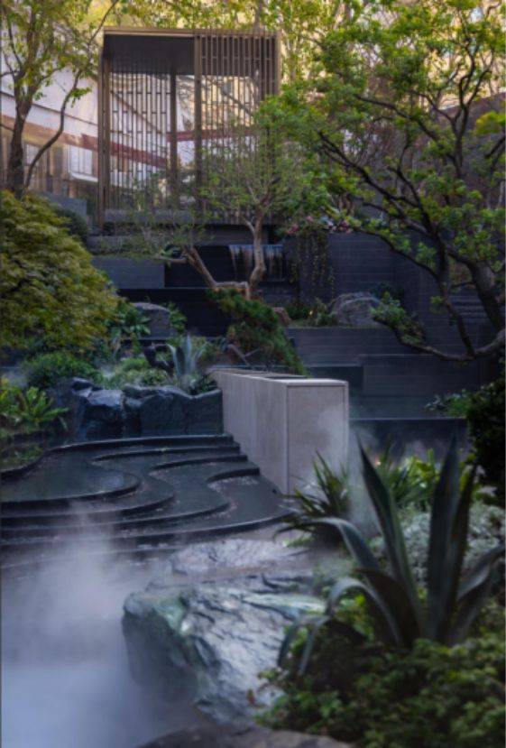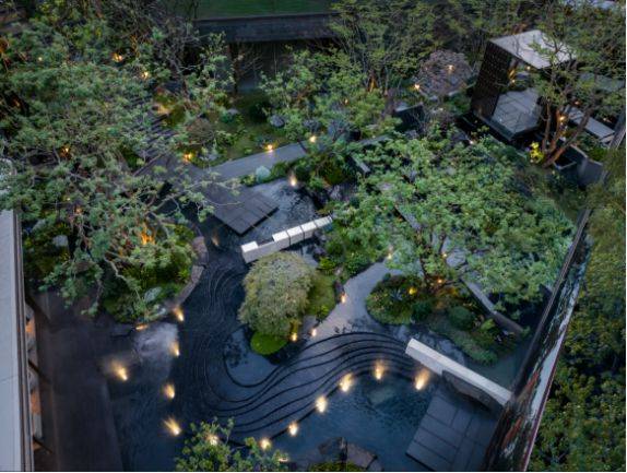 垂直峡谷庭院:近7米高差立体景观移植百年名木与叠瀑溪涧,形成“层峦叠翠”的都市山水长卷;