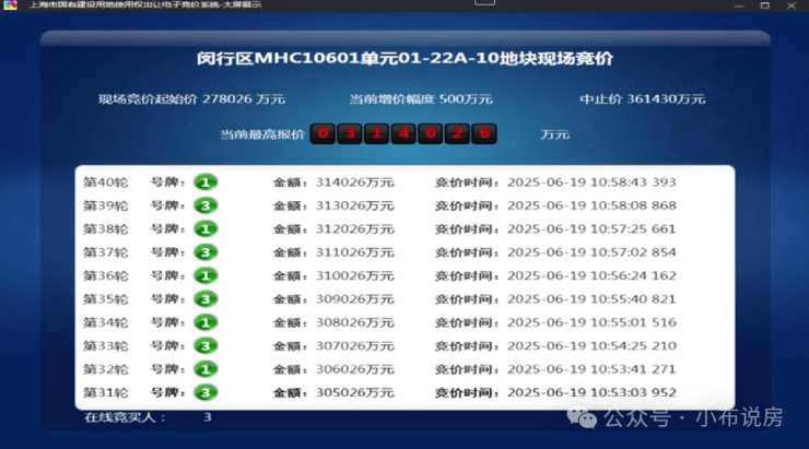 6月19日,闵行1幅地块出让,地块名称为颛桥镇MHC10601单元01-22A-10地块,规划用地性质为住宅用地,出让面积4.05公顷,容积率为2。经过40轮竞拍,最终由上海保利城市发展有限公司竞得,总成交价314026万元,溢价率12.95%。
