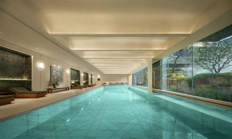 恒温泳池同样考究,约20×8.4米的三泳道设计,空间尺度宽阔,大面积玻璃将自然光柔和引入,又在光影与水波间守住私密性。入水的一瞬,仿佛被带入一个纯粹的静谧世界。