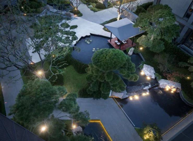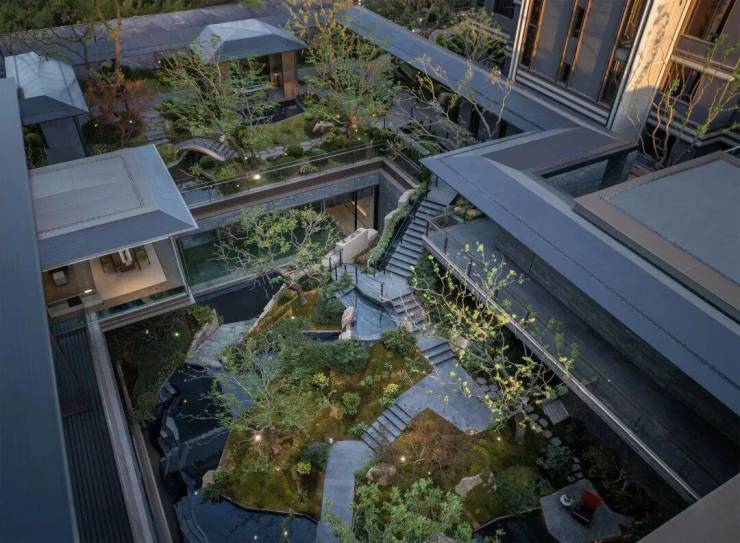 庭院的选材也极具讲究:太行山金景石堆叠成小山丘,岭南古桩铁冬青与中华原生乌桕树移栽而来,蕴含“聚财守业”的美好寓意。细节之处,经得起推敲,让人越看越有味道。
