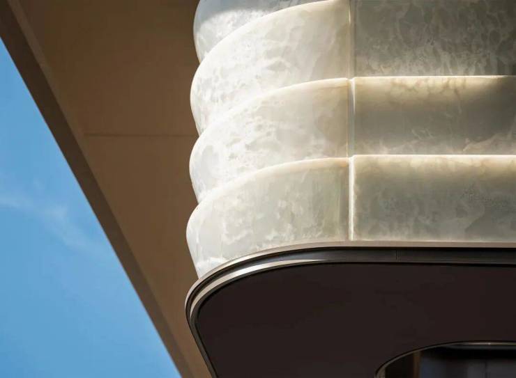 初见逸庐,第一眼落在大门。气势独特,细节满满。一整面由75片珍贵玉石以金属拼接而成的玉石照壁,寓意“金玉满堂”。