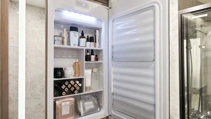 卫浴空间同样精彩,采用高仪的台盆、龙头、智能马桶、淋浴花洒等,主卫创新定制“美妆冰箱”,满足业主对美妆、护肤用品冷藏的需求,足见开发商对成本的舍得。