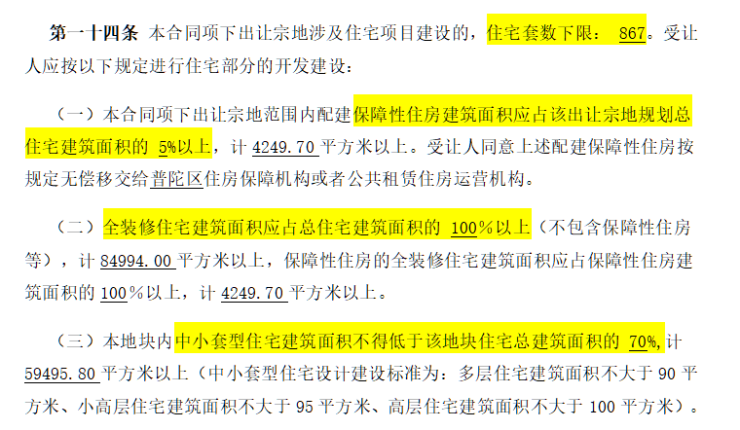 地块用地性质为普通商品房,容积率约2.5,限高80米,住宅套数下限867套,需配建5%以上保障性住房,中小套户型不得低于70%,全装修比例100%!
