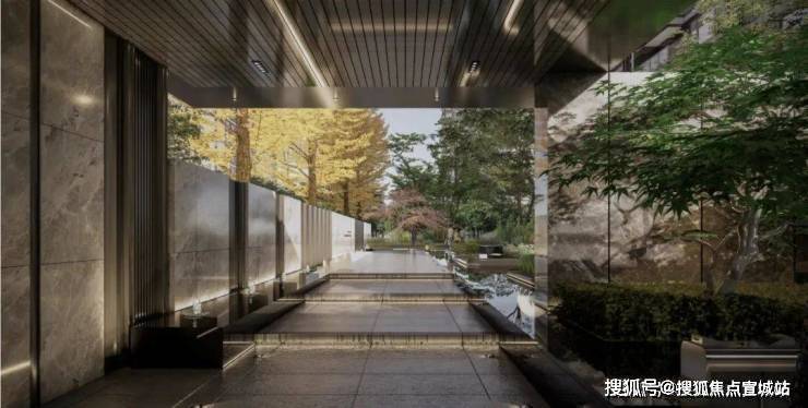 社区大门完全区分人行、车行入口,人行入口采用石材与玻璃搭配设计,大气恢弘!门厅景观水院精致高级,入户仪式感满满!