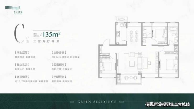 此户型可以说是改善人群非常喜欢的户型,建面约135㎡3房2厅2卫设计,动静分区,四开间朝南,各空间尺度奢阔,还有一个超大面宽的景观阳台,实现功能性和舒适度兼得.