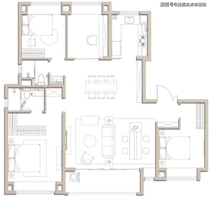 大横厅的设计,让这个户型拥有堪比别墅的南向采光面,这个尺度感以及采光通透度非常出众。