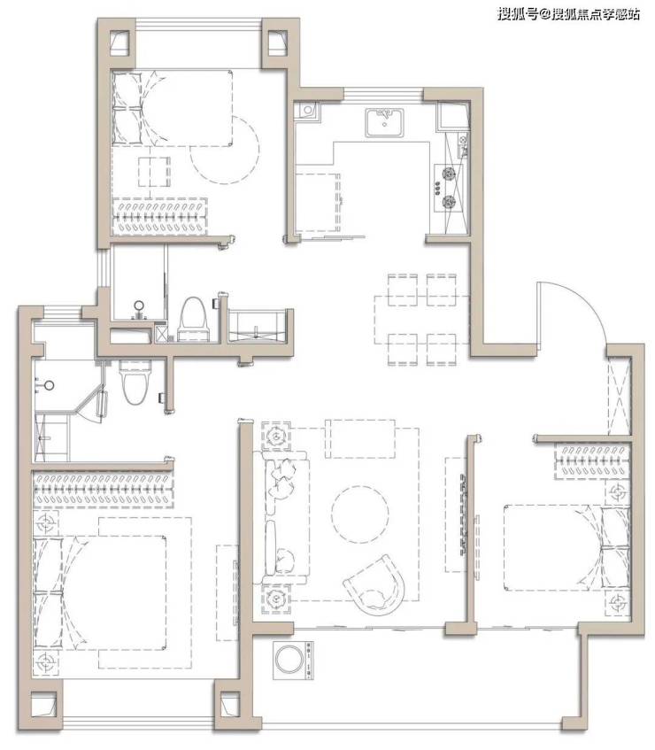 细节方面,入户玄关+主卧套房+客卫干湿分离,这个户型几乎做到了一个好户型应该有的所有。