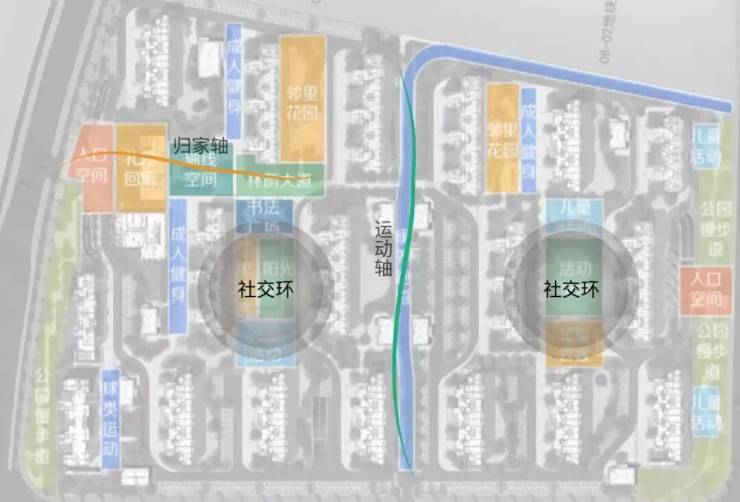 两轴两环三组团自然谧境:归家轴+运动轴,全龄社交双环,邻里花园,健身,运动三组团