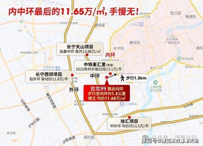 再看环线位置:古北99步行到内环仅约1.3公里,均价11.65万/㎡;而长宁天山项目贴着中环,首开13.88万/㎡;【古北99】24小时vip热线电话:400-8787-740
