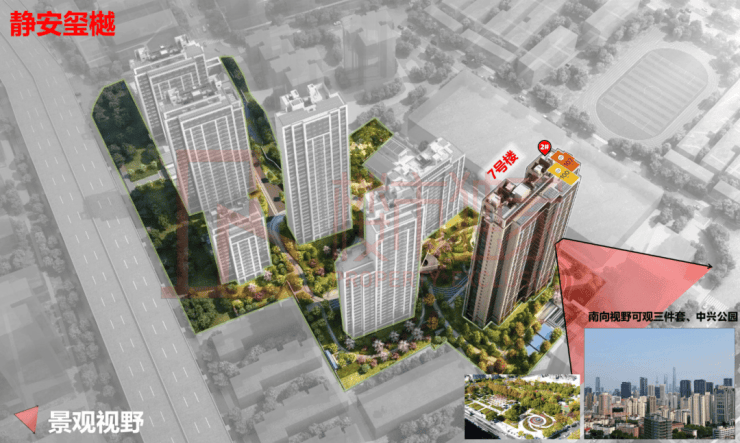 7号楼,位于整个小区的南面头排位置,前排无遮挡,拥有王炸级的城市景观资源: