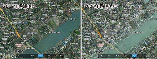 作为黄浦江畔的压轴板块,杨浦滨江的建设速度是有目共睹的,下图是2017-2025年杨浦滨江的卫星影像变化图,几乎是一年一个样!