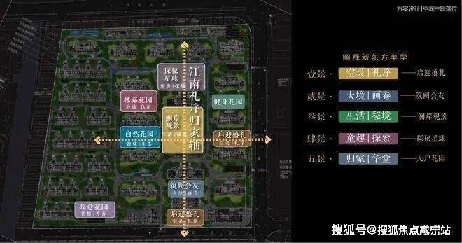 以江南人文精神为源点,打造两轴一环五进空间,江南礼序归家轴串联启迎盛礼、筑阙会友、归家华堂等5重礼制,尊崇归家;健康运动轴以24小时跑道为社区活力生活环,串联儿童乐园、长者康养、疗愈花园等10大生活场景,营造全龄全时的江南诗意生活.