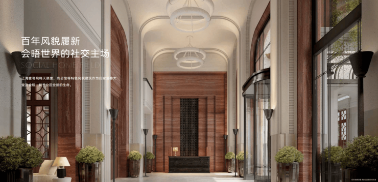 上海壹号院将天顺里、尚公馆等特色风貌建筑作为归家落客大堂及会所,赋予公区全新的生命,让往昔的尊贵与当代的舒适共享同一副躯壳,匠心独运!