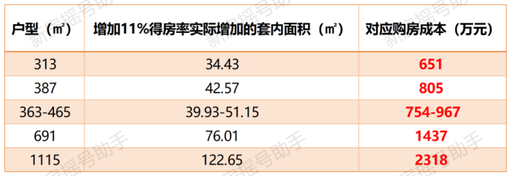 对比同产品约70%左右的得房率,多了11%的实际使用面积,若是购买约313㎡户型,实际使用面积就多了约34.43㎡,按照前期均价约18.9w/㎡来计算,相当于省了约650w+的购房成本!