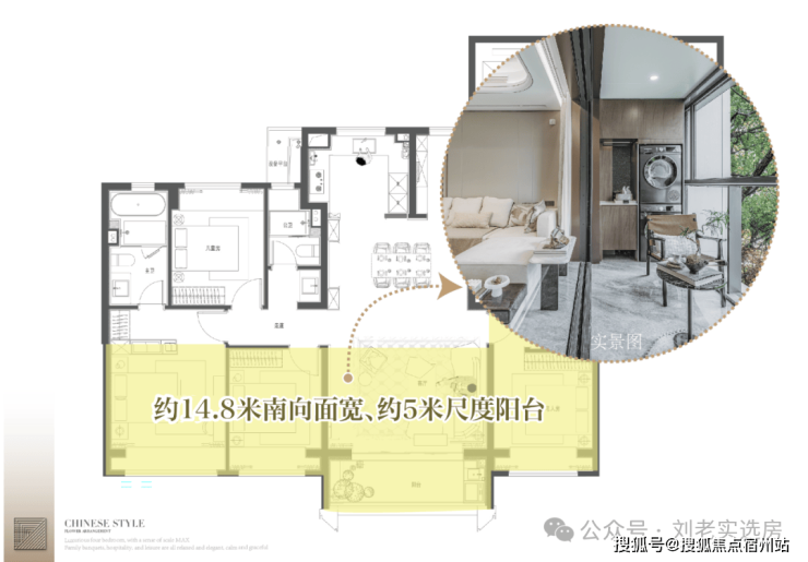 在户型设计的底层逻辑中, 1 54 ㎡正四房以方正通透为基底,四开间朝南形成 约 14.8 米面宽的 IMAX 级采光面 ,三间南向卧室与客厅构成阳光横轴 ,搭配 约 5 米的观景阳台 , 采光效果极佳。