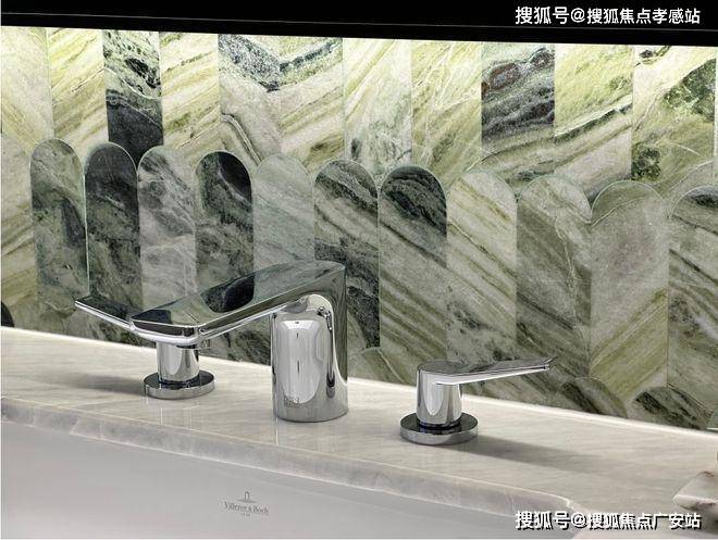 基础硬件都不差,项目在审美上还做了不少创新——卫生间大量采用奢石和石材,比如主卫柜体墙面就是香格里拉翡翠拼花,龙头是冷热分离式,成本更高:
