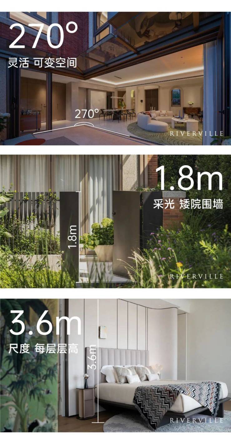 「开阔尺度」:约3.6米层高、超大窗墙比等花园里弄的尺度突破,尽显居者风度。