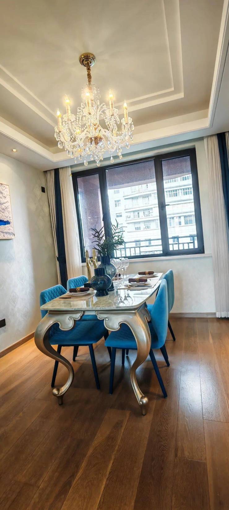 项目外立面1-3层为全进口干挂大理石,上面是深色真石漆,风格为英式古典ArtDeco,庄重典雅。
