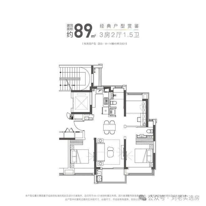 建面约89㎡3房1.5卫,三开间朝南,每个房间都有飘窗,不管是采光度、实用性还是视野都非常不错。