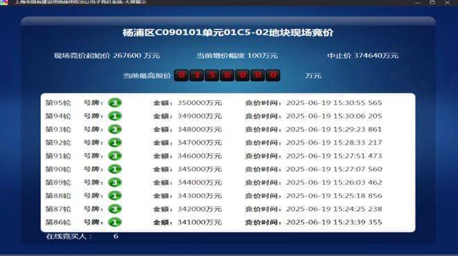 6月19日,2025年五批次土拍,保利发展经过95轮竞价摘得杨浦东外滩01C5-02地块(即保利外滩曜),成交总价350000万元,楼板价95530元/㎡,溢价率30.79%。
