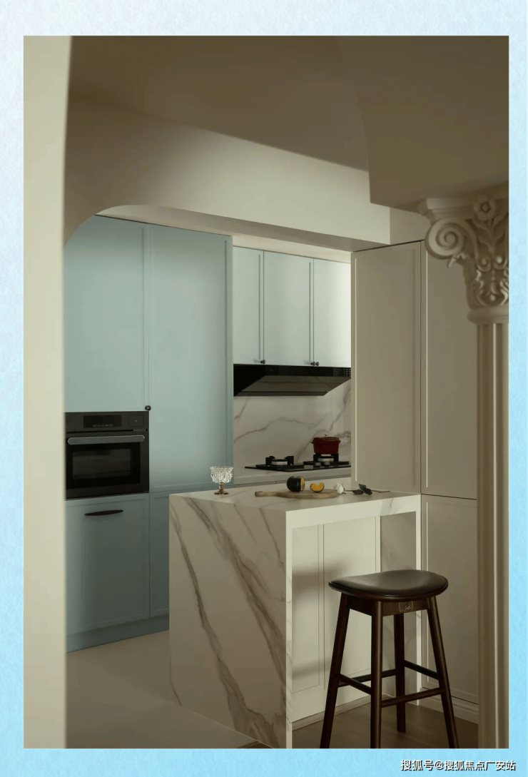 吧台与厨房内的台面顺畅相连,台面下方的柜体不仅增大了厨房物品的收纳空间,还扩展了操作台面的面积。水池台面与吧台齐平,而灶台高度则经过精心调整,以适应屋主的身高和厨房使用习惯。整个厨房以绿豆灰为主色调,搭配奶油色的墙砖,营造出一种既具烟火气又带清欢感的独特氛围,让屋主在烹饪时也能感受到那份难得的温馨与幸福。