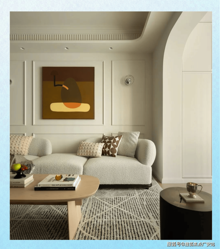 在客厅的空间设计上,我们秉持着简约而精致的原则。吊顶和沙发背景墙都以简洁的石膏线条装饰,营造出一种既古典又简约的氛围,避免了繁琐与复杂。此外,为了打破原有空间的沉闷,我们将客厅与阳台之间两个生硬的墙垛设计成拱形,这一巧妙处理不仅与玄关和餐厅的拱廊相得益彰,还与电视柜上别致的拱形开放书架形成了巧妙呼应。