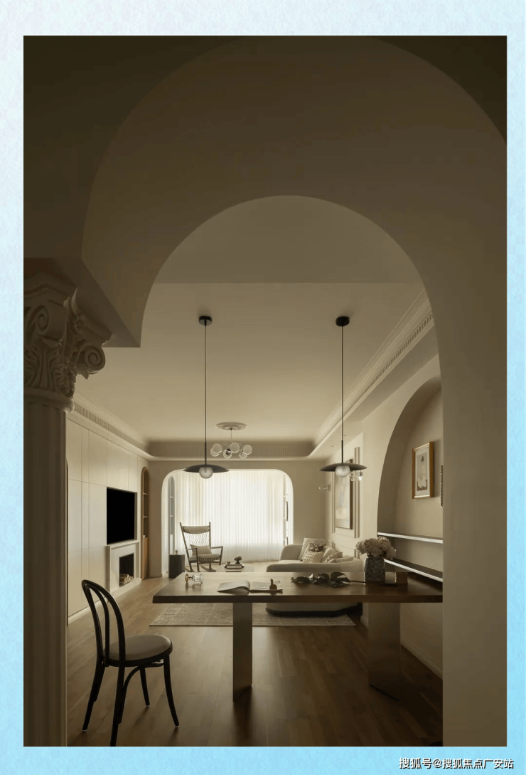 餐厅区域,几组精致的拱廊巧妙地围合出这个温馨的空间。