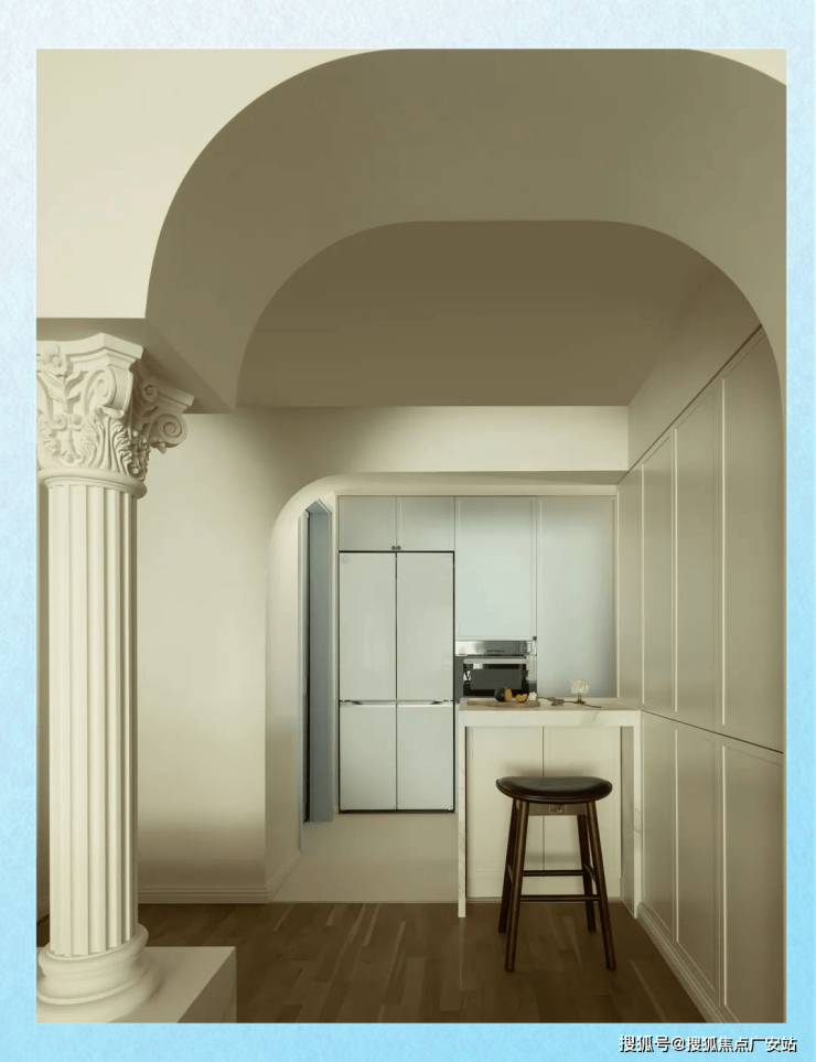 几组拱廊巧妙地将玄关与厨房、餐厅等功能区域相分隔,既划分了空间又保持了连贯性。站在玄关处,视线可以流畅地穿越拱廊,看向其他空间,犹如欣赏一幅生动的画卷。这种设计不仅实用,更赋予了整个家居一种独特的韵律感。