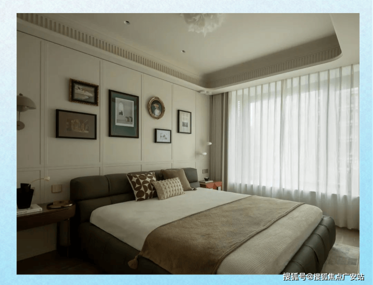 在硬装方面,为了配合中央空调管线,吊顶设计进行了巧妙调整,从而增强了空间的立体感。而床背景墙则选用了法式回字形护墙板,这一设计元素在旁边的衣柜柜门和房门上得到了完美延续,使得整个空间在视觉上更加开阔和统一。